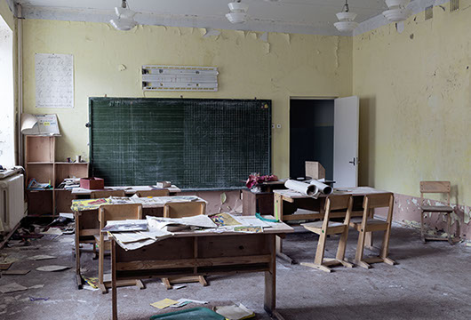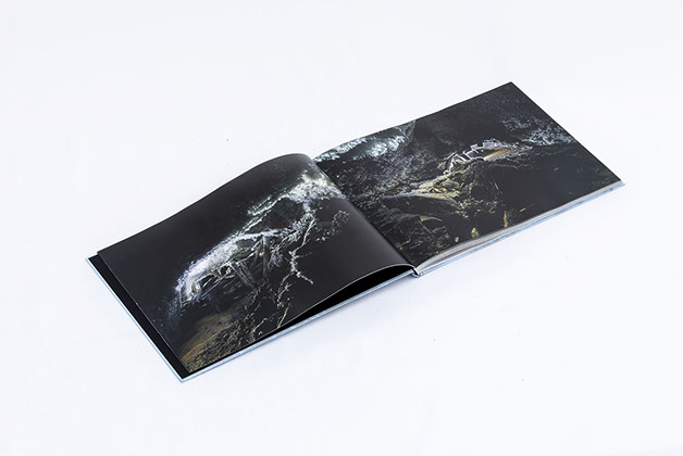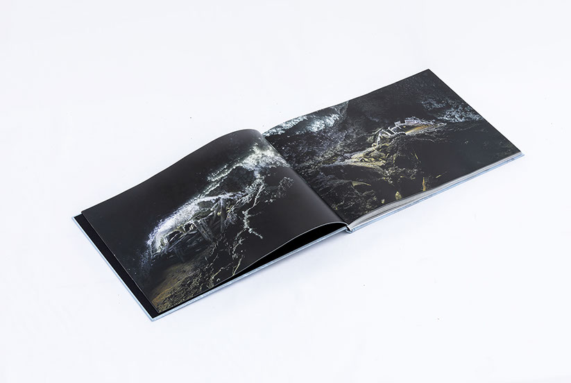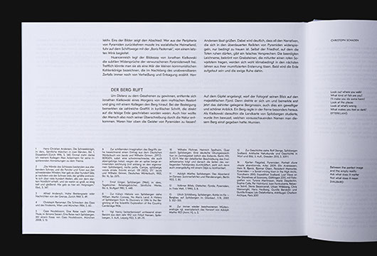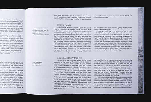 Jonathan Danko Kielkowski's photo book features images of the world's northernmost coal mine and the former Soviet coal settlement Pyramiden on Spitsbergen, which is abandoned since the late 1990s. The cover's typography is a replica of a stencil lettering from inside the coal mine, which, like the Pyramiden settlement itself, is enclosed in Arctic ice blue. Using the grotesque font "GT Eesti," which had its origins in the 1940s Soviet Union, the text section of the book resembles the purist constructions of abandoned Soviet architecture. The book was published to accompany an exhibition at the »Forum für Fotografie« in Cologne in January 2019.