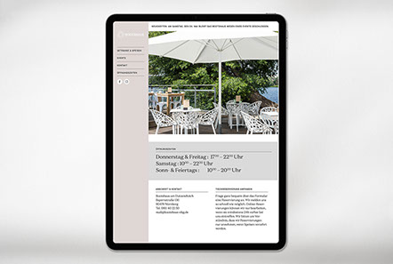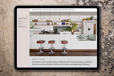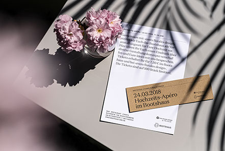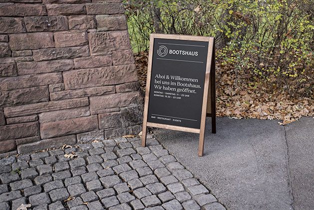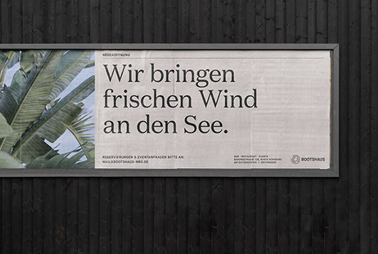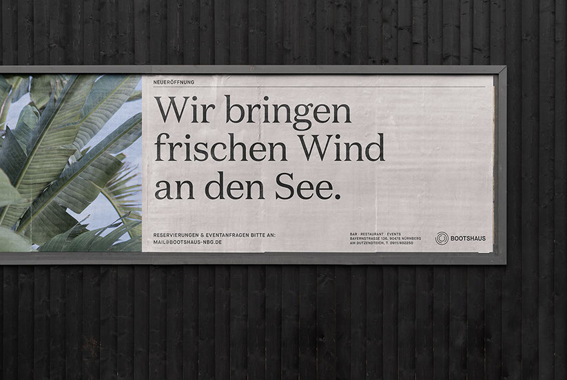 Bootshaus is a restaurant with a lakeside terrace on the banks of Nuremberg's Dutzendteich lake. For the opening in spring 2018, we developed a design concept that combines the maritime esprit and natural chic of the light-flooded location with lake view. The logo features a circular spreading wave shape as a reference to the waterfront location.  Kraft cardboard and natural papers create tactile naturalness while the elegant shapes of the font "Domaine" exude a certain savoir-vivre. Warm light and Mediterranean flora characterize the accompanying photographic imagery.