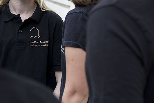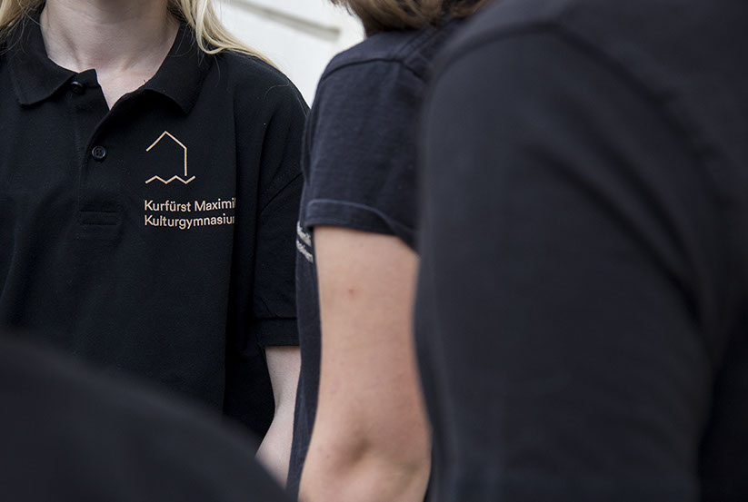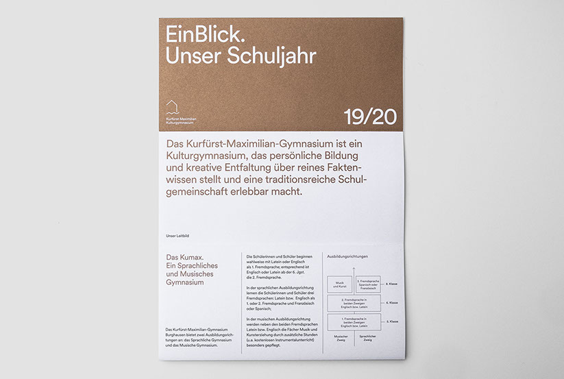 Founded in 1629, the Kurfürst Maximilian Gymnasium in Burghausen is one of the oldest schools in Bavaria. Since 2016, we have been accompanying the school on the river on its way to becoming a »cultural high school«. Together with the newly designed logo, which refers to the school's location directly on the Salzach river, we developed a clear, balanced identity. It combines the school's traditional history and historical architecture with modern school life in the form of clear typography, copper color areas, white uncoated paper and graphic comb and wave structures. We created a consistent visual design system that allows students and teachers alike to identify as a vibrant and stable community. Our design work included print and promotional materials, website, social media, school textiles, school mascots, annual reports, and an orientation system for the large-scale school campus.