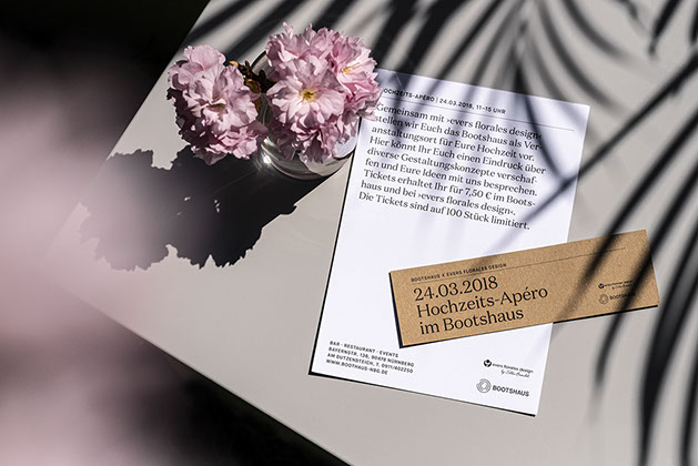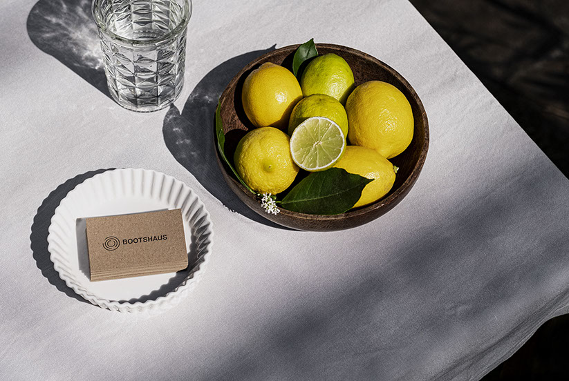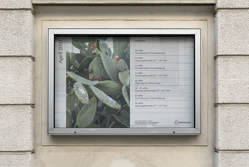 Bootshaus is a restaurant with a lakeside terrace on the banks of Nuremberg's Dutzendteich lake. For the opening in spring 2018, we developed a design concept that combines the maritime esprit and natural chic of the light-flooded location with lake view. The logo features a circular spreading wave shape as a reference to the waterfront location. Kraft cardboard and natural papers create tactile naturalness while the elegant shapes of the font "Domaine" exude a certain savoir-vivre. Warm light and Mediterranean flora characterize the accompanying photographic imagery.