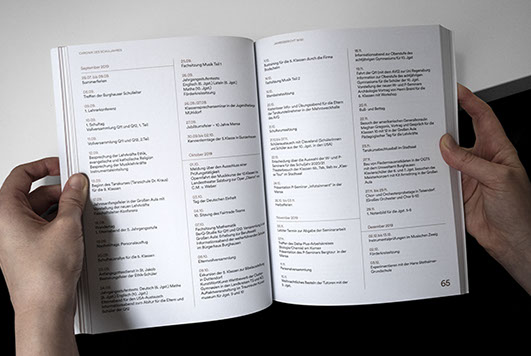 Founded in 1629, the Kurfürst Maximilian Gymnasium in Burghausen is one of the oldest schools in Bavaria. Since 2016, we have been accompanying the school on the river on its way to becoming a »cultural high school«. Together with the newly designed logo, which refers to the school's location directly on the Salzach river, we developed a clear, balanced identity. It combines the school's traditional history and historical architecture with modern school life in the form of clear typography, copper color areas, white uncoated paper and graphic comb and wave structures. We created a consistent visual design system that allows students and teachers alike to identify as a vibrant and stable community. Our design work included print and promotional materials, website, social media, school textiles, school mascots, annual reports, and an orientation system for the large-scale school campus.